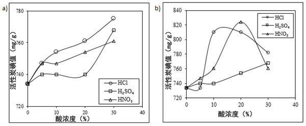 圖1:酸的濃度對活性炭碘值的影響,在(a)18°C和(b)50°C下進(jìn)行酸洗化學(xué)活化。