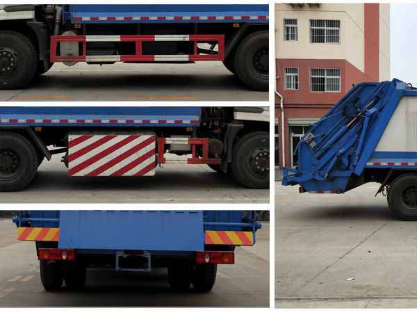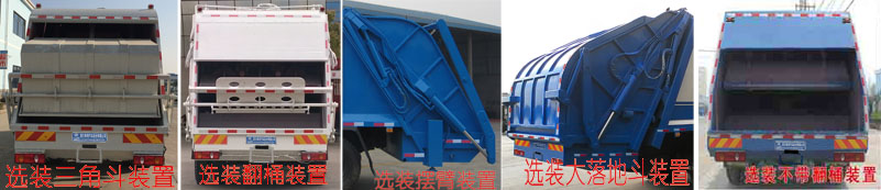 其它 | 1、該車僅選用3950mm,4500mm和4700mm軸距,該車有六種可選翻轉樣式,A:封閉式掛桶裝置(主照片),B:三角斗裝置,C:翻桶裝置,D:擺臂裝置,E:大落地斗裝置,F:不帶翻桶裝置。當選擇ABCDE時,整車后懸為2670mm,離去角為15°,該車整車長(mm)/軸距(mm)的對應關系為:8800/4700,8600/4500,8050/3950;當選擇F時,整車后懸為2420mm,離去角為16°,該車整車長(mm)/軸距(mm)的對應關系為:8550/4700,8350/4500,7800/3950;額定載質量(kg)/駕駛室準乘人數(人)的對應關系為:7345/3,7410/2。2、防護材料:Q235碳鋼,連接方式:左右側面防護采用焊接連接在箱體底板上,后部防護由專用裝置代替豁免,離地高度為450mm. 3、ABS型號為ABS-E 4S/4M和3631010-C2000,生產廠家為威伯科汽車控制系統(中國)有限公司和東科克諾爾商用車制動系統(十堰)有限公司.4、該車安裝帶衛星定位功能的行駛記錄儀.5、該車主要功能:能將垃圾自行壓實裝入,轉運和卸料;主要專用裝置:箱體裝置. | ||