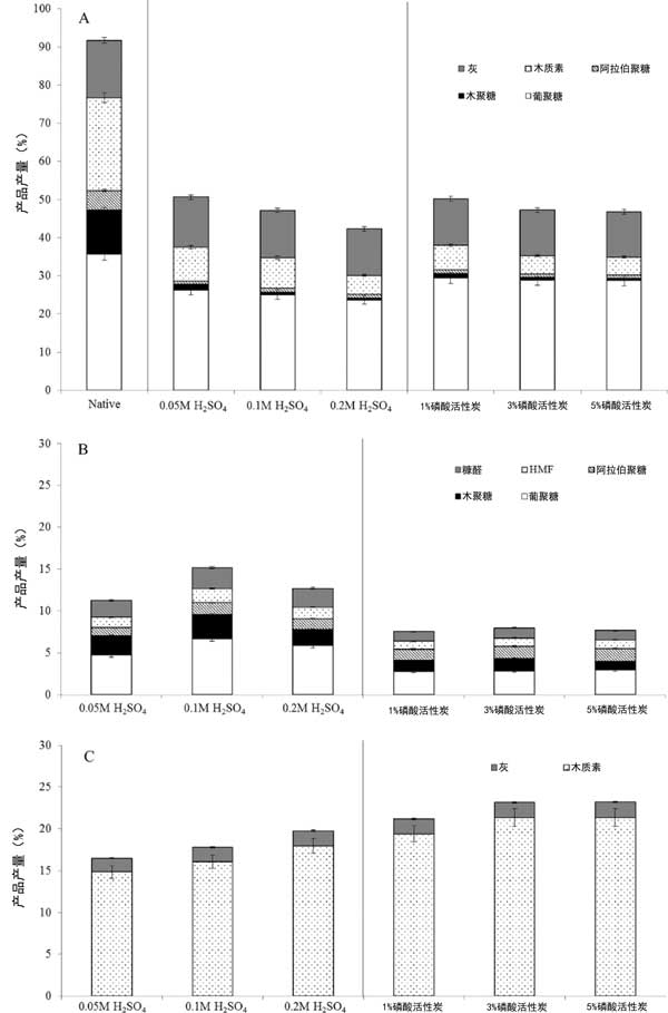 圖2:磷酸加入活性炭的濃度對生物質(zhì)分離的影響(A)固體部分,(B)含水部分,(C)有機部分。