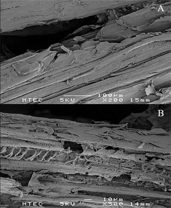 如圖3所示,將通過分離獲得的固相微結(jié)構(gòu)通過SEM與天然RH進行了比較;钚蕴吭牧咸峁┝苏G彝暾谋砻,表明植物材料的高度有序的完整結(jié)構(gòu)(圖3A)。分離的固體殘余物的生物質(zhì)的表面結(jié)構(gòu)顯示出表面和內(nèi)部結(jié)構(gòu)的破壞,并具有空腔和裂紋。該觀察結(jié)果表明半纖維素的去除和表面木質(zhì)素的改變。對于BET表面積測量,分析了原始和預(yù)處理的生物量樣品。