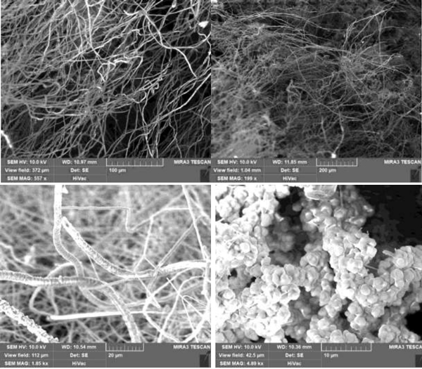 圖4:在圖中描述的不同放大倍數(shù)下獲取的碳化硅纖維的SEM圖像,下面部分的碳化硅成核生長點簇。