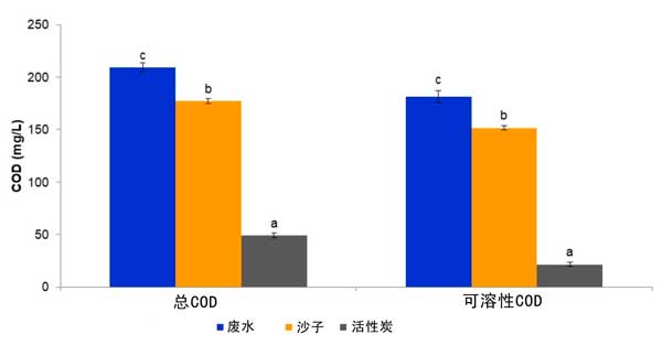 圖2:通過砂濾器和活性炭吸附柱系統(tǒng)處理經(jīng)過生物處理的含殺菌劑的流出物時的總COD濃度和可溶性COD濃度。對于每個測量參數(shù),由相同字母指定的條形在5%的水平上沒有顯著差異。