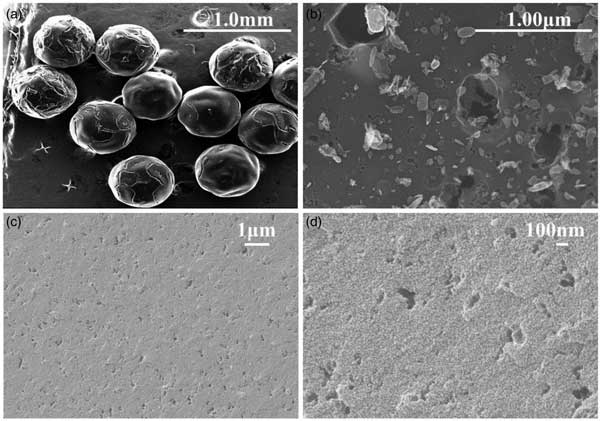 SEM被用于研究活性炭的形態(tài)、表面粗糙度和粒度。其內部孔隙結構信息也可以通過橫截面的SEM進行分析。SEM圖像顯示球型活性炭具有均勻的球形,粒徑(直徑)約為600μm(圖1a)。表面比較光滑,有較大的裂紋和孔隙結構,表面有許多無序的微晶結構(圖1b)。橫截面顯示了一些分布均勻的相對均勻的孔隙(圖1c和1d)。