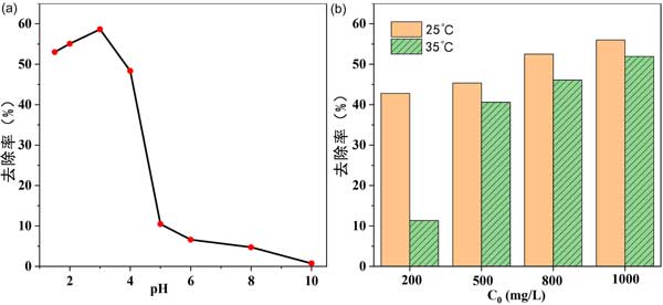 溫度也影響吸附過程?疾炝瞬煌瑴囟认虏煌瑵舛却姿崛芤旱奈竭^程,其他條件不變。結果如圖2(b)所示。對于不同濃度的乙酸稀釋劑,25℃時的吸附去除率高于35℃時的吸附去除率,表明吸附過程是放熱的。因此進一步的實驗僅在25℃下進行。對于工業(yè)應用,室溫條件是可行的,無需提供額外的熱源。