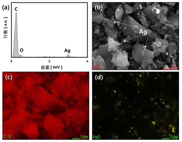 圖2:活性炭載銀復(fù)合材料的FE-SEM和EDS分析結(jié)果:(a)EDS光譜,(b)FE-SEM實(shí)像和(c)碳元素映射圖,(d)Ag元素映射圖像。