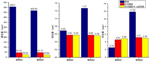 磷含量在兩個兩種植物油中主要由以所示的處理(水重量2%+活性炭0.1克)后減少圖2。植物油1的磷含量降低了大約95.22%,而植物油2的磷含量降低了大約相同的值(94.98%)。油液經(jīng)水脫膠后Mg、Ca含量略有下降,而Ca處理后略有升高。這一結果可能是由于在處理過程中活性炭中存在一些Ca解離回油相;钚蕴繉α缀康拇罅拷档褪怯捎贜aOH改性的活性炭具有極性、帶正電荷的表面。由于存在芳環(huán)簇和固有缺陷,它還具有磁力。在脫膠過程中將活性炭添加到植物油和水中時,活性炭的芳環(huán)簇中的離域電子產(chǎn)生磁矩,強烈誘導磷脂磷酸頭部周圍的順磁性氧。同時,活性炭的極性/親水性也允許與極性水分子相互作用。水分子也被磁場激活,從而發(fā)生氫自旋從旁水到鄰水的重新定向,從而降低水的抗磁性。活性炭誘導的這種磁場會導致表面張力降低,削弱水分子的分子內(nèi)能。結果,更多的水分子被分解成H+離子和OH-離子,促進更多水解反應。這些現(xiàn)象與其他力量相結合:熱能和離心也會引發(fā)磷脂分子內(nèi)的鍵斷裂,導致磷酸頭部基團從磷脂分子上分離(脫磷脂)。