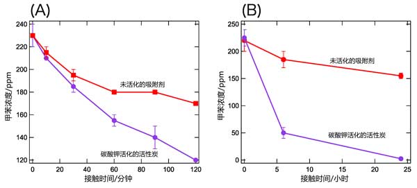 圖3:在(A)120分鐘和(B)24小時(shí)觀察未活化吸附劑(紅色)和活性炭(紫色)期間,甲苯濃度隨時(shí)間的變化。