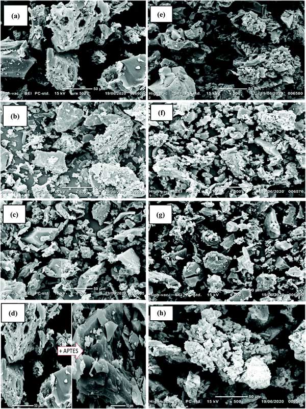 材料的SEM圖像在圖1中給出;钚蕴烤哂胁痪鶆虻墓饣砻妫郊s為50μm(圖1a)。在用硝酸和過氧化氫進(jìn)行氧化處理后,氧物質(zhì)(羧基和硝酸鹽基團(tuán))被接枝,導(dǎo)致活性炭-OH的表面比活性炭更粗糙(圖1e)。通過APTES處理接枝氨基硅烷是成功的:活性炭-APTES和活性炭-OH-APTES表面分別比活性炭和活性炭-OH更光滑(圖1d和f)。裂縫和不均勻的空腔可用作氟化物的吸附位點。存在的粗糙表面和大量白色顆粒證實了Al顆粒的添加(圖2c、g和h)。這些白色顆粒可以對應(yīng)于結(jié)合到材料表面的不同形狀和尺寸的Al納米顆粒的不同簇。