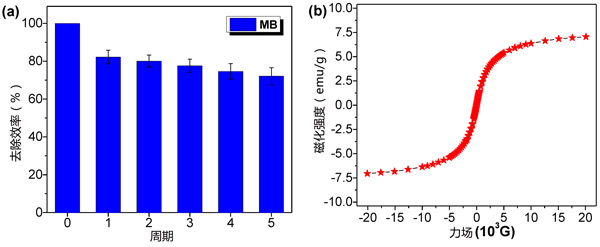 首先,研究了活性炭含量對(duì)磁性吸附劑吸附能力的影響。為了比較,活性炭的吸附容量也在相同條件下確定。在較高的初始染料濃度(5.0mM)下,磁性活性炭對(duì)MB和MO的飽和吸附能力明顯增加,隨著活性炭含量的增加。但是對(duì)于實(shí)際的吸附應(yīng)用,非常需要具有良好可重復(fù)使用性的吸附劑。我們通過使用乙醇作為洗脫劑來評(píng)估吸附MB的磁性活性炭的可重復(fù)使用性。如圖3a所示,解吸的磁性活性炭的去除效率隨著重復(fù)使用次數(shù)的增加而降低。與原來的去除效率相比,經(jīng)過5個(gè)解吸-吸附循環(huán)后,去除效率保持在72.1%左右。盡管如此,再生的活性炭的吸附能力仍然比較高,高于傳統(tǒng)的磁性吸附劑。此外,即使經(jīng)過5次再生吸附循環(huán)后,磁性活性炭仍表現(xiàn)出與新制備的相似的飽和磁化強(qiáng)度值(圖3b),表明這次的新型吸附劑具有良好的結(jié)構(gòu)穩(wěn)定性。