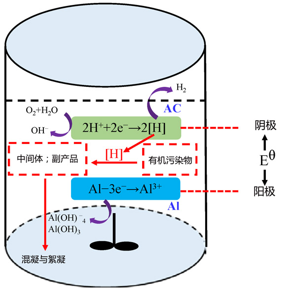根據(jù)實(shí)際工況,提出了一種可行的活性炭載鋁微電解工藝分解水生環(huán)境中有機(jī)污染物的反應(yīng)機(jī)理(圖2)。由于其高吸附容量和電導(dǎo)率,活性炭被用作陰極保護(hù)。在陽(yáng)極(鋁廢料),由鋁提供的電子通過(guò)微型原電池轉(zhuǎn)移到陰極(活性炭),吸附在陰極表面的有機(jī)污染物受到這些釋放的電子的攻擊。水電離產(chǎn)生的H+在陰極獲得電子并產(chǎn)生具有強(qiáng)化學(xué)反應(yīng)性的活性氫[H]或H2,和活性氫[H]·可以部分降解有機(jī)污染物。此外,Al失去三個(gè)電子形成鋁離子(Al3+)。然后,鋁離子沉淀形成氫氧化鋁(Al(OH)3、Al(OH)-4等)。作為有利的絮凝劑,這些氫氧化鋁可以有效去除廢水中的有機(jī)污染物。難降解污染物在活性炭載鋁微電解工藝的輔助下被分解為小分子中間體,也可以通過(guò)氫氧化鋁絮狀污泥的絮凝共沉淀來(lái)消除。換言之,與活性炭載鋁微電解工藝相關(guān)的許多協(xié)同效應(yīng)可以有效地分解水環(huán)境中的有機(jī)污染物。