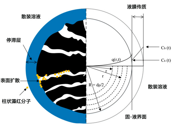 在第一實(shí)驗(yàn)階段獲得的吸附平衡測(cè)試的實(shí)驗(yàn)數(shù)據(jù)適合等溫線模型Langmuir、Freundlich和Redlich-Peterson。將最適合吸附平衡數(shù)據(jù)的等溫線模型的參數(shù)值應(yīng)用于HSDM模型,以模擬SBA柱中的吸附過(guò)程。該模型考慮了發(fā)生在兩個(gè)連續(xù)擴(kuò)散步驟中的吸附過(guò)程,即:通過(guò)活性炭顆粒周圍的固定流體層擴(kuò)散(膜擴(kuò)散)和通過(guò)活性炭?jī)?nèi)部孔的擴(kuò)散(表面擴(kuò)散),如圖2所示。