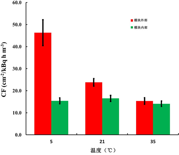 對于實(shí)驗(yàn),使用三種活性炭的織物為探測器設(shè)計(jì)了單獨(dú)的模塊。對于前兩種活性炭,模塊是HDPE,對于第三種活性炭,模塊是LDPE。單獨(dú)設(shè)計(jì)遵循上述方法,考慮到每種活性炭織物的確切單獨(dú)質(zhì)量。在所有設(shè)計(jì)中,不同溫度下的k(T)值根據(jù)方程式計(jì)算。活性炭的結(jié)果如圖2所示。5℃時(shí)的CF0比35℃時(shí)的CF0高305%。相比之下,對于放置在補(bǔ)償模塊中的傳感器,CF的變化在17%以內(nèi)(最大值/最小值=1.17)。值得注意的是,在模塊內(nèi)部不同溫度下暴露的傳感器的CF之間的配差異在95%的顯著性水平上沒有統(tǒng)計(jì)學(xué)意義。發(fā)現(xiàn)所描述的帶有補(bǔ)償模塊的探測器的CF明顯高于其他常用的無源氡探測器。
