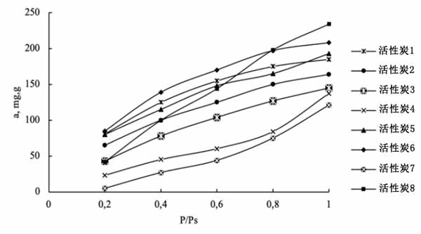 來自植物廢料的活性炭中,活性炭的K值表示吸附劑的吸收能力的最高值,活性炭2的最佳值是由于微孔體積大。表征煤與丁醇相互作用的能量的模型參數n是活性炭的最小參數。這對應于最凸的吸附等溫線(圖2),這有利于捕獲低濃度的丁醇蒸氣。就活性炭3而言,除活性炭4外,所有活性炭均優(yōu)于活性炭5,與活性炭2相當。根據極限飽和值,由圖1和圖2中的動力學曲線證明。如圖1所示,繪制了相應的吸附等溫線(圖2)。
