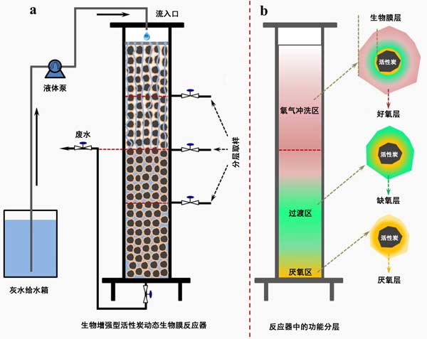 圖2:a活性炭動態(tài)生物膜反應(yīng)器示意圖和b灰水期間活性炭反應(yīng)器中的功能區(qū)和生物膜層在顯著分層位置處理。