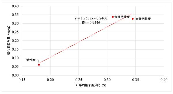 圖3:活性炭中氧化鉀含量對(duì)硫化氫吸附的影響。