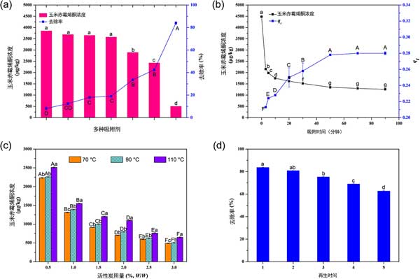 圖1:不同工業(yè)吸附劑(a)、吸附時間(b)、活性炭用量和吸附溫度(c)以及活性炭再生穩(wěn)定性(d)對玉米赤霉烯酮嚴重污染的玉米油中玉米赤霉烯酮去除的影響。