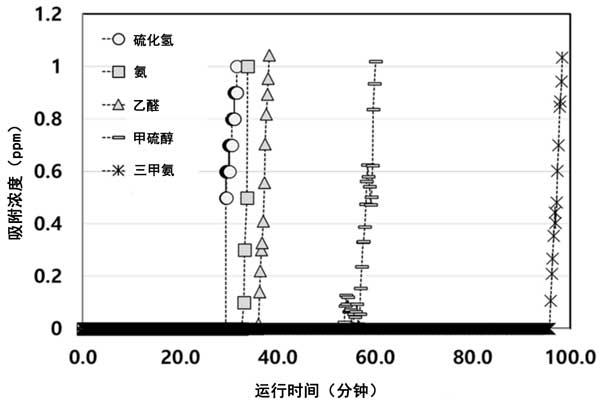 為了評(píng)估活性炭對(duì)不同廢氣的有效吸附量,應(yīng)研究其吸附能力。廢氣的氣味閾值和刺激水平在十億分之一的水平。吸附劑的總吸附容量很難用作從廢物中去除廢氣的設(shè)備的設(shè)計(jì)因素。因此,我們根據(jù)突破點(diǎn)計(jì)算了小于1ppm的有效吸附量。突破柱實(shí)驗(yàn)在304不銹鋼管式反應(yīng)器中進(jìn)行,總流量為1L/min,其中包含硫化氫(H2S)、氨(NH3)、乙醛(AA)、甲硫醇(MM)和三甲胺(TMA),如圖2所示。突破曲線依次為H2S、NH3、AA、MM、TMA。與廢氣相比,TMA具有更好的動(dòng)態(tài)吸附性能,因?yàn)樗哂懈L(zhǎng)的突破時(shí)間和相應(yīng)的更大的有效吸附容量(<1ppm)。