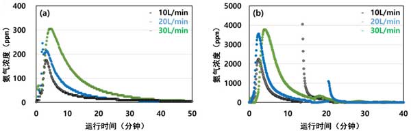 圖3:解吸流速對(duì)1000ppm濃度下(a)40ppm和(b)100℃在活性炭上吸附的影響。