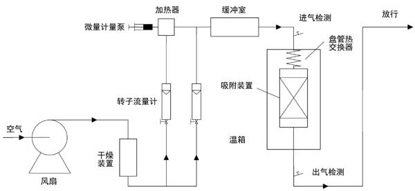 動態(tài)吸附技術(shù)用于測量甲苯吸附平衡等溫線。圖1描述了實驗裝置。通過該裝置獲得吸附飽和的活性炭。在不同的溫度和濃度下,測量了甲苯的飽和吸附容量。入口溫度和甲苯濃度設定為25–180℃和5–50g/m3;钚蕴课降募妆綒怏w濃度為15g/m3。使用重量分析技術(shù)測量吸附等溫線。實驗裝置以實驗室環(huán)境空氣為氣源,通過鼓風機將空氣送入裝置。在硅膠干燥裝置中除去水蒸氣后,通過數(shù)顯質(zhì)量流量計的控制,按計算出的比例分成兩路。單向氣流以設定濃度進入氣體發(fā)生裝置,即甲苯揮發(fā)后的載氣,在氣體緩沖室中與反向流動的稀釋氣體充分混合后進入吸附系統(tǒng)。在吸附系統(tǒng)中,吸附柱緊密均勻地填充CTC100活性炭顆粒,并用鐵架垂直放置在設定實驗溫度的恒溫干燥箱中;旌霞妆綒怏w首先在恒溫干燥箱內(nèi)通過氣體預熱管道達到實驗溫度,然后進入裝有活性炭的吸附柱進行吸附實驗。吸附氣體通過檢測口進入檢測系統(tǒng),智能FID通過連續(xù)采樣測量甲苯出口濃度。當氣體發(fā)生裝置產(chǎn)生的入口濃度與智能FID檢測的出口濃度一致時,吸附柱中的活性炭達到吸附平衡。吸附氣體通過檢測口進入檢測系統(tǒng),智能FID通過連續(xù)采樣測量甲苯出口濃度。當氣體發(fā)生裝置產(chǎn)生的入口濃度與智能FID檢測的出口濃度一致時,吸附柱中的活性炭達到吸附平衡。吸附氣體通過檢測口進入檢測系統(tǒng),智能FID通過連續(xù)采樣測量甲苯出口濃度。當氣體發(fā)生裝置產(chǎn)生的入口濃度與智能FID檢測的出口濃度一致時,吸附柱中的活性炭達到吸附平衡。