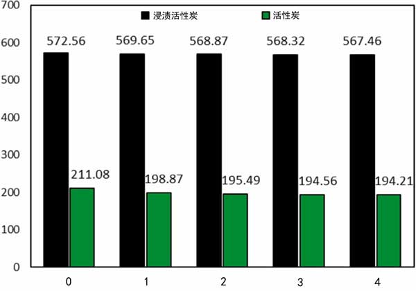 為了研究吸附劑吸收汽油蒸汽的性能,我們進一步評估了樣品在吸附-解吸循環(huán)中的可重復(fù)使用性。在恒溫下,1小時后,當吸附劑達到飽和狀態(tài)時,浸漬再生過程。四個吸附循環(huán)后,蒸汽吸附容量為567mg/g,所用吸附劑保持大量吸收分子。HMTA-AC-D樣品表明蒸汽吸收略有減少約0.89%,而活性炭樣品的這一量為7.9%(圖3)。在高循環(huán)下,由于孔隙的逐漸破壞和不完全脫氣,吸收量可能會顯著降低。根據(jù)我們的發(fā)現(xiàn),與文獻相比,制成的吸附劑在物理和熱學上表現(xiàn)出更高的穩(wěn)定性。這些結(jié)果表明,樣品在回收汽油蒸汽時具有很高的可持續(xù)性,可以作為一種有效的吸附劑提出并考慮。
