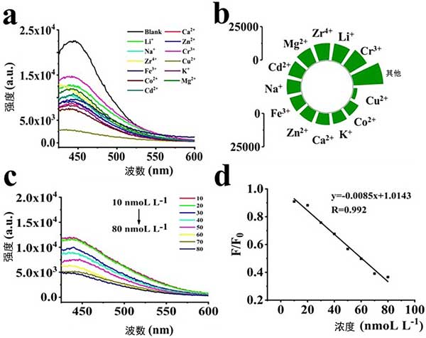 圖2:(a)12種金屬離子的納米活性炭點的熒光發(fā)射光譜,(b)360nm處的熒光強(qiáng)度,(c)不同濃度Cu2+的熒光發(fā)射光譜,(d)Cu2+檢測的線性曲線。