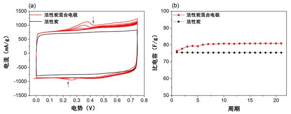 通過評估電化學性能,初步測試了活性炭復合材料作為混合電極的潛在應用。為此,通過將浸泡在1M/H2SO4電解質(zhì)中的隔膜夾在兩個相同的電極(活性炭或混合材料)之間來組裝對稱電池。圖3a顯示了活性炭和混合材料在20mV/s恒定掃描速率下的循環(huán)極化(CP)曲線。由于雙電層電容(EDLC)的影響,交流對稱電池的CP曲線形狀為矩形。另一方面,活性炭混合電極觀察到準矩形CP曲線NPs對稱細胞,具有源自納米銀的各種氧化還原波,與矩形(電容)包絡重疊。這種CP結(jié)構(gòu)表明法拉第和EDLC兩種電荷存儲機制的共存。值得注意的是,隨著循環(huán)次數(shù)的增加,觀察到的銀波變得更小并且變得難以察覺,這表明存在一定程度的不穩(wěn)定,正如對游離多金屬氧酸鹽納米銀所觀察到的那樣。白銀波浪的減少之間存在相關性(圖3a)在前幾個周期內(nèi),根據(jù)CP面積計算出的比電容有所增加(圖3b)。這可以通過氧化銀薄層與銀的比電容差異來解釋。盡管如此活性炭混合電極的比電容略高于裸活性炭電極,活性炭的比電容為75F/g,活性炭混合電極在20次循環(huán)后達到81F/g。該結(jié)果表明,混合材料具有電活性,并且在對稱超級電容器配置中超過了一定程度的交流電。活性炭和混合電極電池的比電容隨著電流密度的增加而降低。對于活性炭混合材料在掃描速率為2mV/s時最高值為83.5F/g,在掃描速率為50mV/s時進一步下降至77.5F/g。高掃描速率下比電容的降低歸因于電解質(zhì)離子的低擴散。由于時間限制,高倍率充放電過程中電解液中的離子運動始終受到擴散限制,僅利用外層活性表面進行電荷存儲。減慢掃描速率可以讓電解質(zhì)更徹底地滲透到孔隙中,并與電極材料的內(nèi)表面有更多的接觸,從而導致電極表面存儲更多的電荷(更大的電容)。