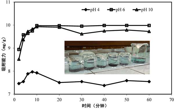 圖3:使用1.0g磁性活性炭吸附50mLFe(II)100ppm,并在28℃下改變吸附時間和pH值。