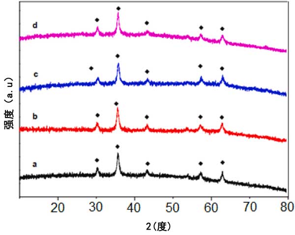 圖4:活性炭磁鐵礦復合材料的X射線衍射圖(a)磁性活性炭吸附前、吸附后(b)pH4、(c)pH6和(d)pH10。