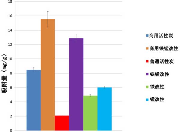 為了比較各種活性炭吸附砷(V)的效果,將0.1克活性炭添加到50mL/50ppm砷(V)樣品中。將樣品以150rpm攪拌6小時,然后過濾,然后對濾液進行元素分析。為了比較不同活性炭基質(zhì)的功效,以每克活性炭吸附的砷(V)毫克數(shù)(mg/g)來比較相對于添加的活性炭量的吸附。如圖所示數(shù)字​圖1,與鐵、錳和鐵/錳一起官能化后,砷的吸附有顯著改善。