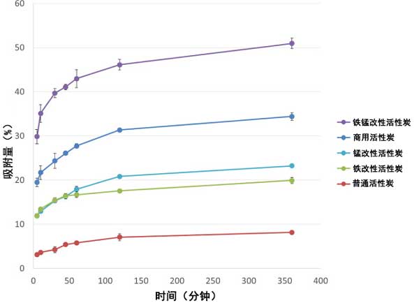 復(fù)合鐵錳活性炭顯示出最高的吸附容量,6小時后的吸附量達(dá)到總吸附量的50.93±1.17%。這表明比標(biāo)準(zhǔn)活性炭和單金屬負(fù)載活性炭都有顯著改進。鐵錳負(fù)載活性炭的二元系統(tǒng)協(xié)同工作,在吸附過程中利用了上述所有吸附機制,使得吸附容量比單金屬負(fù)載活性炭材料增加更多。