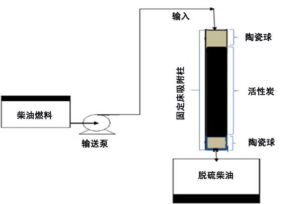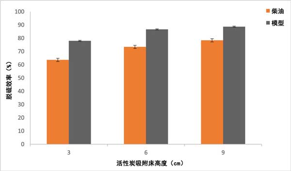 柴油和模型柴油用作油原料,以評估活性炭和改性活性炭的脫硫工藝。柴油初始硫濃度為7510ppm。兩種柴油原料用于固定床吸附塔裝置的脫硫工藝。為了進(jìn)行脫硫?qū)嶒灒褂糜嬃勘脤⒂驮纤腿胨。采用垂直向下固定床吸附塔裝置連續(xù)吸附硫化合物,流量為1mLs-1。柱子逐漸裝載不同高度的活性炭層(3-9厘米),對應(yīng)于不同的活性炭重量(10、7和4克)。
