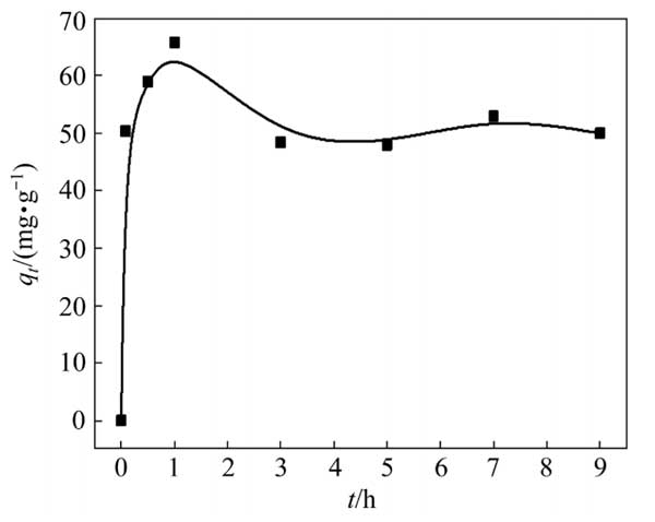 用100mL硫代硫酸銅溶液進(jìn)行銅吸附動(dòng)力學(xué)試驗(yàn),初始銅濃度為3g/L。硫代硫酸鹽與銅的摩爾比為8:1。除另有說(shuō)明外,0.5g活性炭用于吸附試驗(yàn)。圖2顯示了Cu(S2O3)23−在活性炭上的吸附動(dòng)力學(xué);钚蕴繉(duì)銅的吸附容量在前1h急劇增加,隨后略有下降并趨于穩(wěn)定。