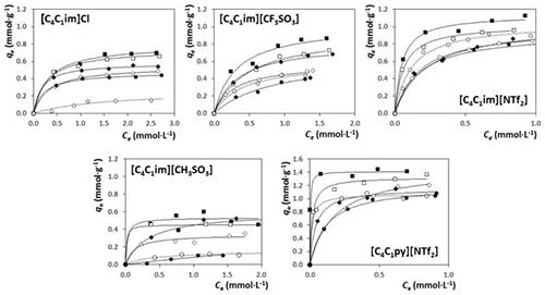 得到的結(jié)果表明,活性炭的不同的吸附能力與IL的性質(zhì)和溶液中的鹽量有關(guān)。一般而言,對(duì)于咪唑鎓的ILs,陰離子對(duì)其對(duì)活性炭的吸附能力的影響按照以下順序:Cl - ≈[CH 3 SO] <[CF 3 SO 3 ] -<[NTf 2 ] 。這一趨勢(shì)的結(jié)果和預(yù)計(jì)的相符合,并且表明,隨著陰離子疏水性的增加,活性炭對(duì)ILs的吸附逐漸增加。另一方面,考慮到IL陽(yáng)離子家族,活性炭能吸附更多的吡啶鎓比基于咪唑類的對(duì)應(yīng)物?傊@里證明,如果伴隨使用無(wú)機(jī)鹽來(lái)促進(jìn)鹽析現(xiàn)象并增強(qiáng)隔離度,則活性炭也可以用作水介質(zhì)中低濃度存在的親水性IL的有效吸附劑。得到的結(jié)果表明, 在鹽的存在下,親水性ILs的例如[C 4 C 1 im] Cl和[C 4 C 1 im] [CH 3 SO3 ]的K d值增加高達(dá)5.5倍。這種新方法可以被設(shè)想為減少由使用IL的工業(yè)過(guò)程產(chǎn)生的含水物流污染的有希望的途徑。