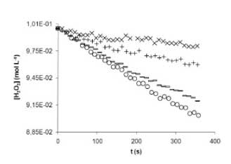 為了獲得關(guān)于活性炭的化學性質(zhì)的更多信息,就其酸性-堿性和氧化還原性質(zhì)而言,研究了溶液的pH和過氧化氫中活性炭表面的化學修飾的影響。 。對于該反應(yīng)混合物與過氧化物濃度0.100mol L的固定組合物-1和CAT等于2,00x10 -3克·毫升-1 在298K的溫度下發(fā)現(xiàn):在2-10個pH單位的溶液范圍內(nèi),初始反應(yīng)速率沒有顯著變化。該結(jié)果與Bohem滴定法給出的活性炭中官能團的組成一致,其中活性酸基團與堿性基團相比是非常低的比例。強氧化劑,如高錳酸鉀和過氧化氫,會大大改變影響過氧化氫的表面(圖1),從而可以推斷活性炭表面存在還原基團作為過氧化氫的活性位點;钚蕴勘砻娴幕瘜W處理按以下方式進行:用HNO3濃度5mol L-1 6個小時,用KMnO 4濃度0.08mol L-1在酸H 2 SO 4 濃度為0.5mol L-1 4小時用H 2 ö 2 的30%72小時。在每次處理結(jié)束時,將活性炭置于索氏提取器中一周,直到保證恒定的pH值。最后將活性炭在110℃下干燥至不再減輕重量,然后儲存在干燥器中。
