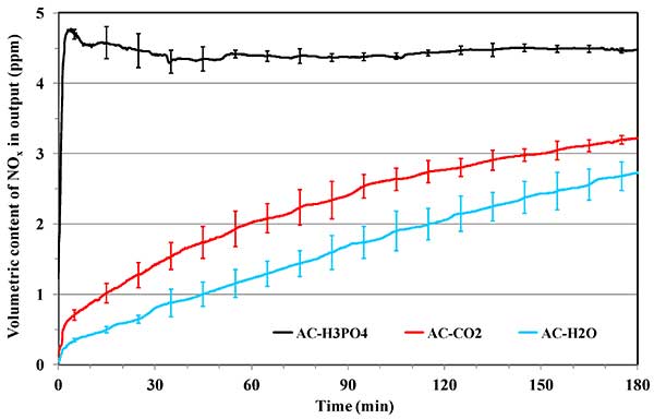 盡管用于汽車和工業(yè)廢氣都實(shí)施了減排措施,城市人口與車輛的增加導(dǎo)致了更多氮氧化物的排放。使用木質(zhì)纖維為前體制造的活性炭在環(huán)境溫度去除氮氧化物。這些活性炭吸附劑表現(xiàn)出令人感興趣的吸附容量范圍在40mg/g和120mg/g之間。然而,這些活性炭的性能通常在干燥和潮濕條件下在空氣存在下在500-1000ppmNO濃度下進(jìn)行評(píng)估。
