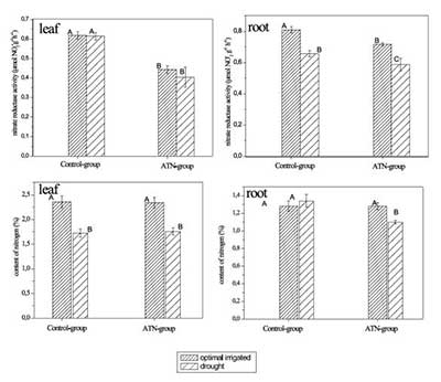 硝酸還原酶(NR)活性水平和兩個組(活性炭和對照)的葉和根中的氮含量如圖2所示。這些結(jié)果表明干旱條件誘導(dǎo)了兩個組(對照和活性炭組)的根中的硝酸還原酶活性的顯著降低,以及活性炭混合物組根部中的N吸收降低。
