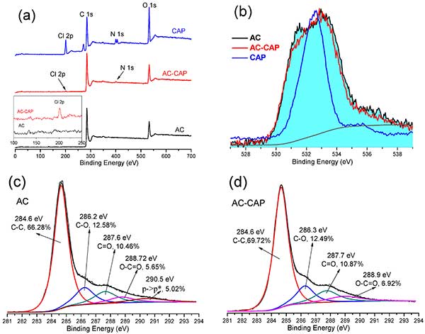 為了進(jìn)一步了解活性炭吸附氯霉素的機(jī)理,用XPS分析活性炭吸附前后的氯霉素(0.3 mmol / L)。圖2中示出了XPS測量光譜,活性炭吸附之前和之后的氯霉素的O 1s和C 1s峰。由C 1s譜確定的表面官能碳原子的計算相對含量也列于圖 2c,d中,并且計算的原子比率總結(jié)。主要的C 1s峰符合以下組的五條曲線:286.6eV的石墨結(jié)構(gòu),286.2eV的CO(苯酚,醇或醚基),287eV的C = O(羰基和醚基),O = 288.7eV處的CO(羧基或酯基),并且在290.5eV處π->π*躍遷。