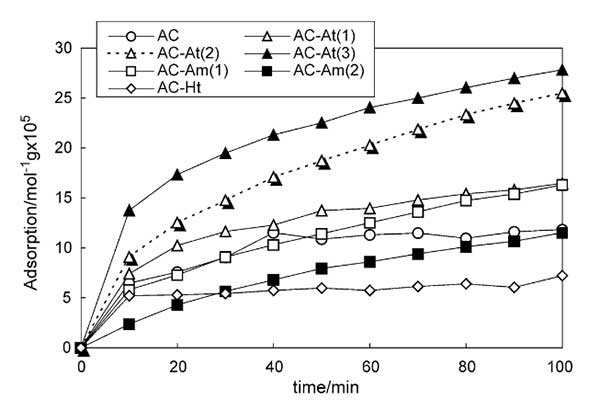 實(shí)驗(yàn)條件:在N2中使用210ppm的甲硫醇作為甲硫醇?xì)怏w;钚蕴康闹苽,活性炭通過碳化隨后活化制備。用蒸汽進(jìn)行活化。用HNO3/H2SO4溶液進(jìn)行活性炭的酸處理。將1克活性炭在100立方厘米HNO3/H2SO4溶液中在室溫下攪拌0.5小時(shí)。過濾分離經(jīng)過處理的活性炭,并在超聲條件下用去離子水洗滌數(shù)次,直到水的pH值達(dá)到5以上。然后將活性炭在100℃空氣中干燥12小時(shí),在150℃下真空干燥1小時(shí)。用HNO3,HNO3/H2SO4(1/1比例)和HNO3/H2SO4(1/3比率)處理的活性炭分別表示為AC-At(1.2.3)。胺化合物對(duì)活性炭的改性通過十六胺的吸附來進(jìn)行。將活性炭浸入十六烷胺/乙醇溶液中并在室溫下攪拌30分鐘。然后過濾分離活性炭并在室溫下真空干燥2小時(shí)。由4×10-6和3.3×10-5摩爾m-3十六胺溶液制備的活性炭分別表示為AC-Am(1.2);钚蕴(AC-Ht)的熱處理在Ar氣氛中在600℃下進(jìn)行2小時(shí)。