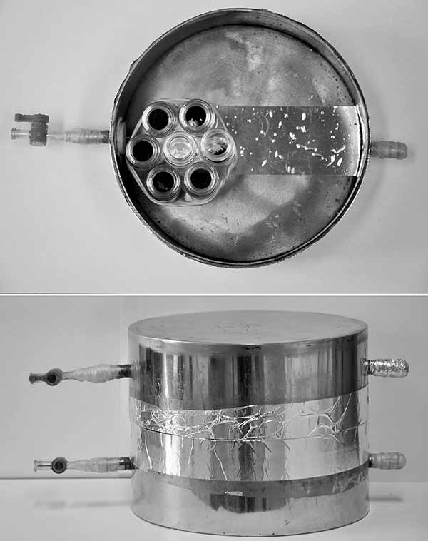 將0.15g活性炭或生物炭稱入20ml透明頂空小瓶中。將三次重復(fù)(每次總共6個(gè)小瓶)放入容器中。容器由兩個(gè)不銹鋼圓柱形盒子構(gòu)成,每個(gè)15厘米內(nèi)徑和4厘米高(圖1)。將5mL純氯化苦液體注入20ml透明頂空小瓶中并放入容器中以產(chǎn)生飽和蒸氣相。將小瓶放入容器后,用鋁帶密封容器。然后將容器置于溫度穩(wěn)定在30℃的培養(yǎng)箱中。孵育3,6,9,12和24小時(shí)后,從培養(yǎng)箱中取出容器。打開(kāi)容器并在通風(fēng)櫥中通風(fēng)約30分鐘。然后使用與已經(jīng)描述的相同的方法分析活性炭炭或生物炭。