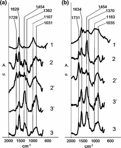 圖2:活性炭-A(a)和活性炭-B(b)的FTIR光譜:初始(1),吸附(2-3)和電化學環(huán)化(2',3')從含有4-氯苯氧基乙酸的電解質溶液。