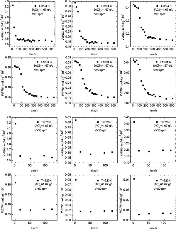 圖1:氯化鈀復(fù)合離子初始濃度的初始濃度對活性炭吸附影響。實驗條件:pH1,Cl-=0.1mol·kg-1。
