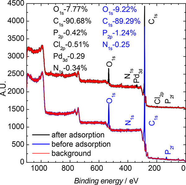 吸附過程之前和之后材料的完整XPS光譜如圖2所示?紤]到觀察到的溶液中Pd(II)濃度的降低,估計鈀負載等于0.7%(m/m)?梢钥闯鰜碜遭Z的峰出現(xiàn)。對這個峰值進行更深入的分析可以為我們提供有關(guān)鈀電子結(jié)構(gòu)的信息。