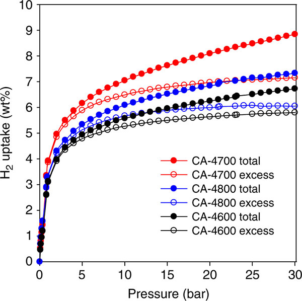 活性炭中的氫儲存需要具有最高表面積和適當(dāng)尺寸的孔的材料。在-196和25℃下使用重量法在HidenXEMIS分析儀上在0-30巴的壓力范圍內(nèi)研究活性炭的儲氫能力。圖2顯示了活性炭在-196℃下的過量和總氫吸收等溫線。對于所有CA-4T活性炭,氫吸收是可逆的,沒有滯后現(xiàn)象,并且在0-30巴的壓力范圍內(nèi)沒有達(dá)到飽和。我們首先注意到1巴的氫吸收非常令人印象深刻,在3.1-3.9wt%的范圍內(nèi)。這種儲氫比為高表面積活性炭傾向于在2-3重量%范圍內(nèi)的任何報(bào)告的值高得多。我們將這種特別高的吸收特性歸因于非常高的微孔表面積和富氧表面的組合,特別是對于3.9重量%的活性炭樣品CA-4700。富氧表面的效果是對于活性炭樣品CA-4600,其盡管具有適度總表面積和微孔表面,仍然表現(xiàn)出的吸收比以前發(fā)現(xiàn)的活性炭材料具有高得多的表面積。經(jīng)過研究發(fā)現(xiàn),具有氧官能團(tuán)的活性炭效果預(yù)期在低壓下具有最大效果,其中氫和表面之間的相互作用比在較高壓力下更重要,其中通過空間填充機(jī)制更可能發(fā)生氫吸收。