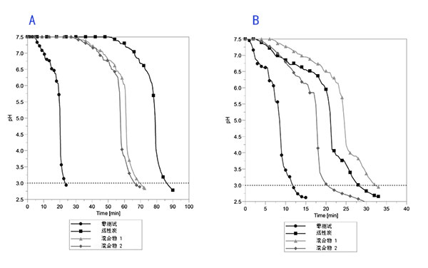 圖1a顯示了在上述的試驗結(jié)果。可以看出,在22分鐘后,氣體洗滌瓶中的pH值降至3以下,而在反應(yīng)器中不使用活性炭吸附劑樣品。用活化的氧化鋁樣品裝載反應(yīng)器分別產(chǎn)生66和71分鐘的穿透時間。用浸漬的活性炭實現(xiàn)了最佳性能,即氯化氫吸附容量為0.0288g/g。將氣體流速提高所取得的結(jié)果如圖1b所示。要進(jìn)行的第一次試驗是在反應(yīng)器中沒有活性炭吸附劑負(fù)載,并且在12分鐘后氣體洗滌瓶中去離子水的pH值降至3以下。對于浸漬的活性炭,氯化氫吸附容量從0.0288g/g降低至0.0172g/g。