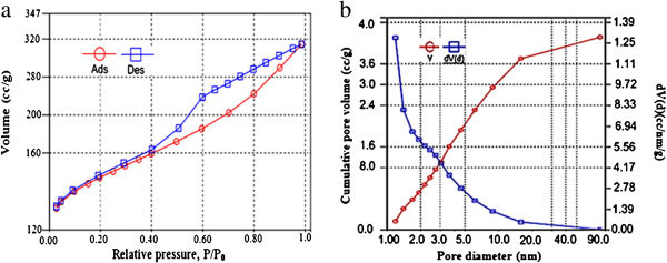 圖3、活性炭的氮吸附/解吸等溫線(a),活性炭顆粒的孔徑分布(b)。