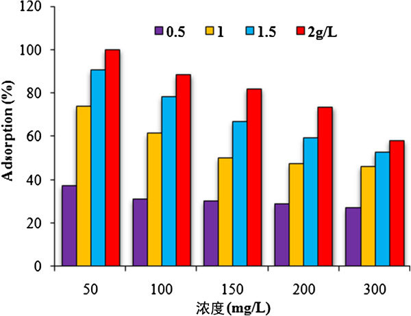 圖5、各種苯胺濃度對(duì)其在活性炭上的吸附的影響:pH=6,t=300min,濃度 = 50-300mg/L,W=0.5-2g/L和T=20℃。