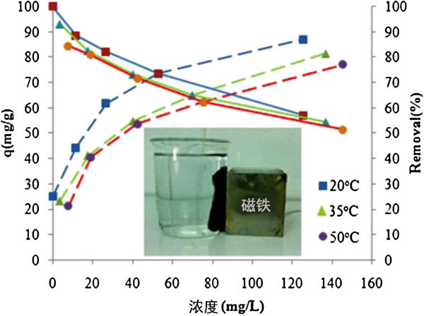 圖6、各種溫度對(duì)對(duì)活性炭吸附苯胺的影響:pH=6,t=300 min,濃度=50-300 mg/L,W=2 g/L,T=20-50°C。
