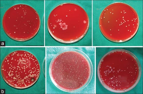 圖4:(a)厭氧培養(yǎng)48小時后活性炭刷毛的菌落形成單位。(b)厭氧培養(yǎng)48小時后的非炭鬃毛菌落形成單位。