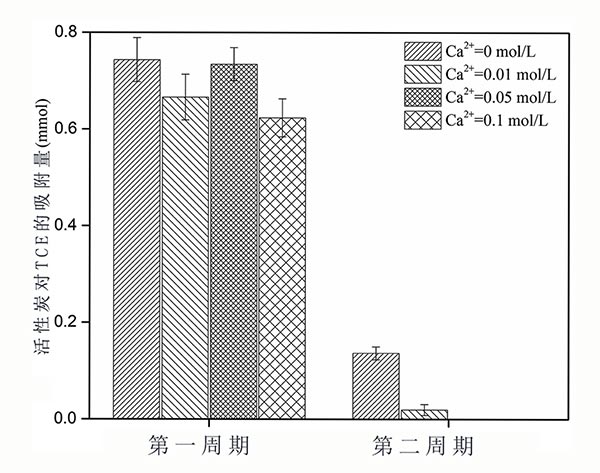 如圖2所示,進(jìn)行了兩次吸附/再生循環(huán)。在第一次吸附/再生循環(huán)期間,當(dāng)鈣離子存在時(shí),TCE去除明顯減少。顯然,在第二次吸附/再生循環(huán)期間,即使進(jìn)行活性炭的再生,也難以在鈣離子條件下除去TCE。這表明鈣離子不僅在活性炭的吸附能力,而且在其再生過(guò)程中都起著重要作用。原因可能是由于鈣離子與其他離子的結(jié)合,導(dǎo)致其容易在活性炭表面上沉淀并影響其吸附能力,導(dǎo)致第二循環(huán)中TCE去除的減少。