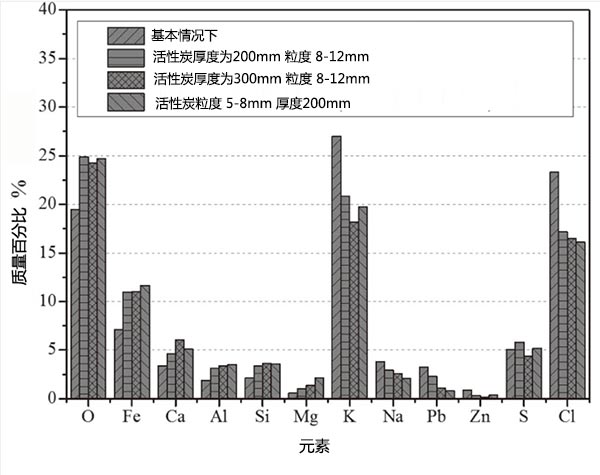 圖4顯示了煙氣通過活性炭之前和之后的化學(xué)組成。可以發(fā)現(xiàn)PM 2.5中的+ Fe,Ca,Si,Al和Mg的含量在煙氣通過活性床時比基礎(chǔ)情況下都有所增加,而K,Na,Pb的含量, PM 2.5中的 Zn和Cl都出現(xiàn)了下降。圖5給出了煙氣經(jīng)過活性炭層后在過濾器中收集的PM 2.5的SEM圖像,觀察到經(jīng)活性炭去除后,較大顆粒的數(shù)量主要由K和Cl組成減少(圖5)(b)-5(d))與基本情況比較(圖5(a))雖然有許多較小的顆粒,如球形顆粒(圖5(d)),主要包含F(xiàn)e和Ca這種現(xiàn)象與PM 2.5的化學(xué)成分變化非常一致。此外,與使用厚度為200毫米,粒度為8-12毫米的活性炭床的情況相比(圖5(b)),出現(xiàn)了較少的大的富含K-Cl的顆粒,并且出現(xiàn)了許多較小的球形富含F(xiàn)e-Ca的顆粒。